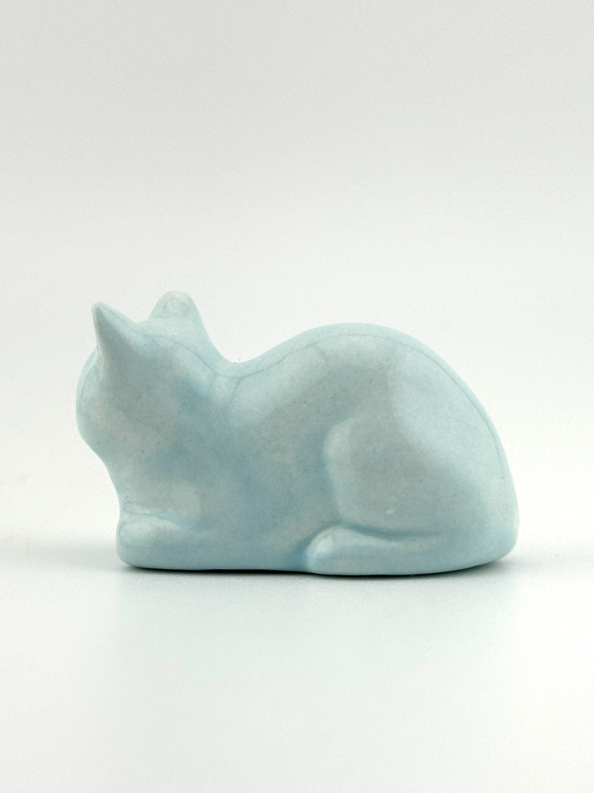 Add a touch of charm to your collection with this petite, handcrafted ceramic cat figurine. Measuring approximately 1.5 inches long and just over 1 inch tall, this adorable feline is curled up in a relaxed pose, exuding peaceful energy and calm.