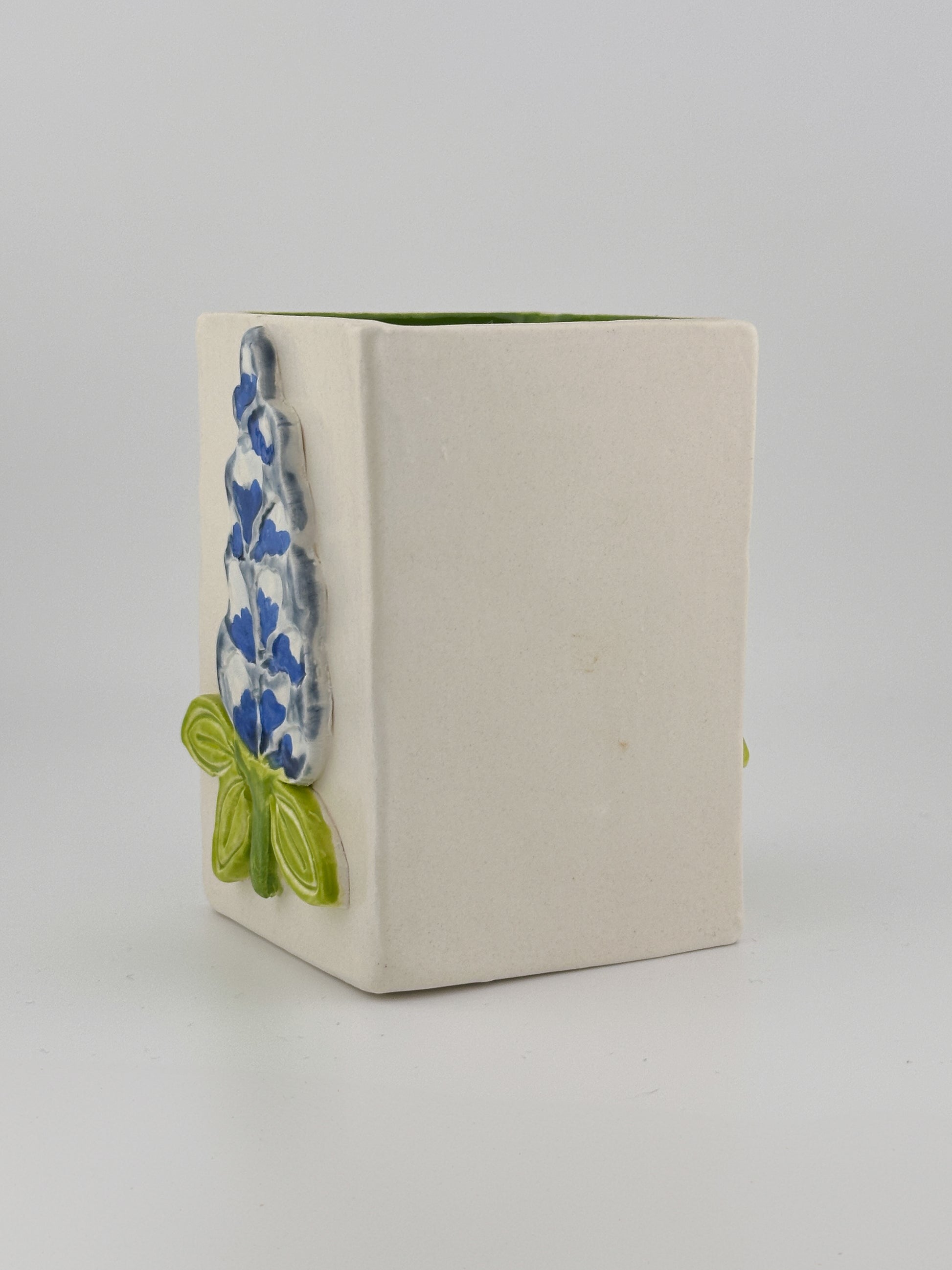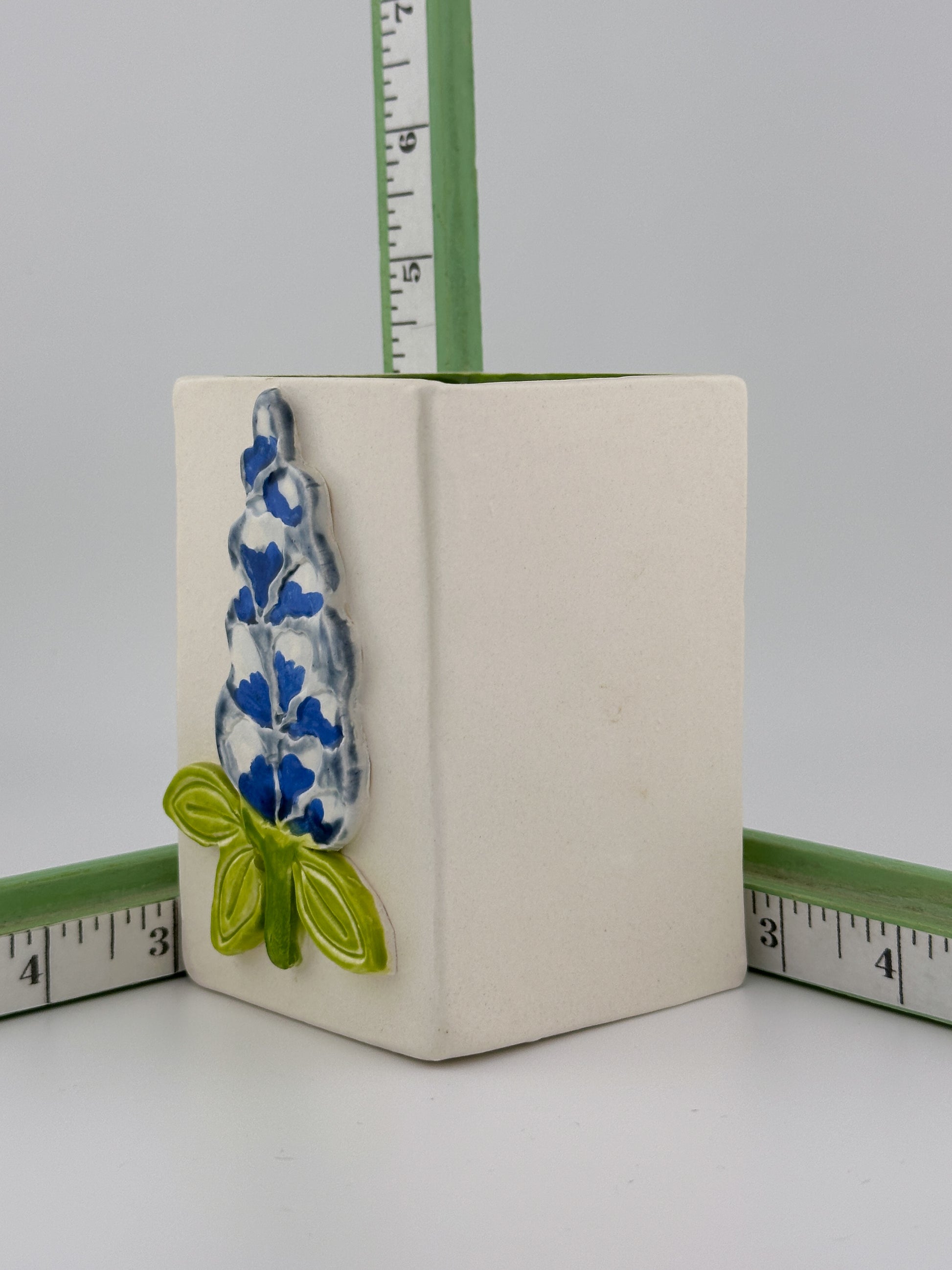 This versatile ceramic container features hand-sculpted and hand-painted bluebonnets on two sides, bringing the charm of Texas wildflowers into your space. With a smooth, ivory-toned exterior and a vibrant green glazed interior, it’s perfect as a small flower vase, a stylish pencil holder, or a cheerful succulent planter. The raised bluebonnet detail adds a tactile, artistic touch that makes this piece stand out. Measuring approximately 5 inches tall and 3 inches wide, it’s both decorative and functional—ideal for desks, shelves, or windowsills. A perfect gift for nature lovers or anyone with Texas roots.