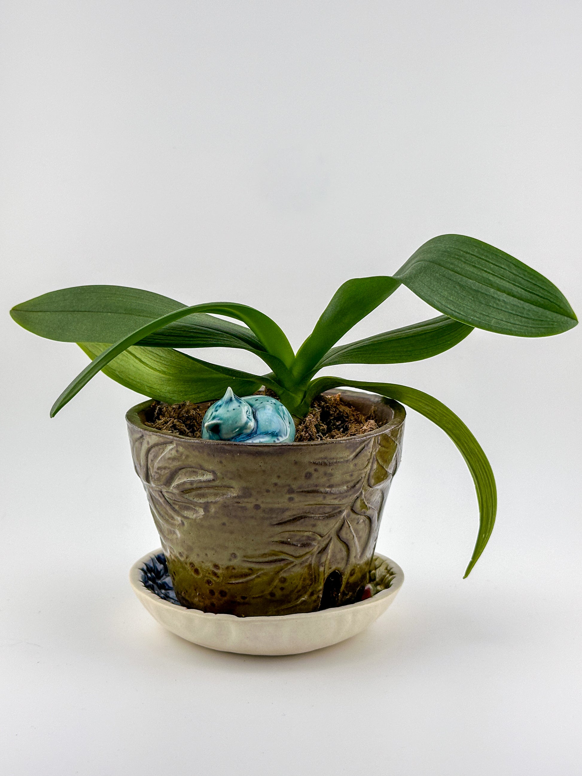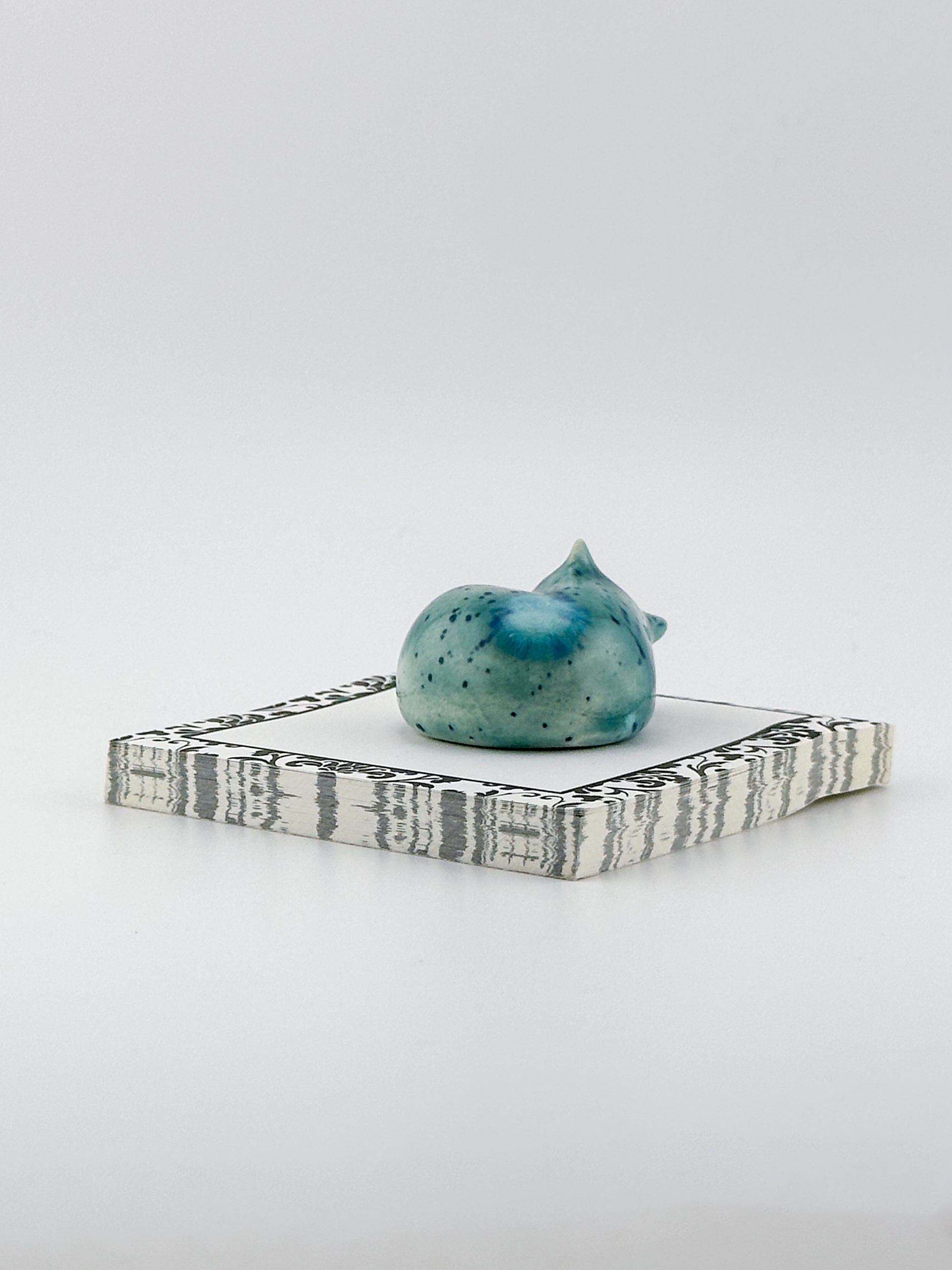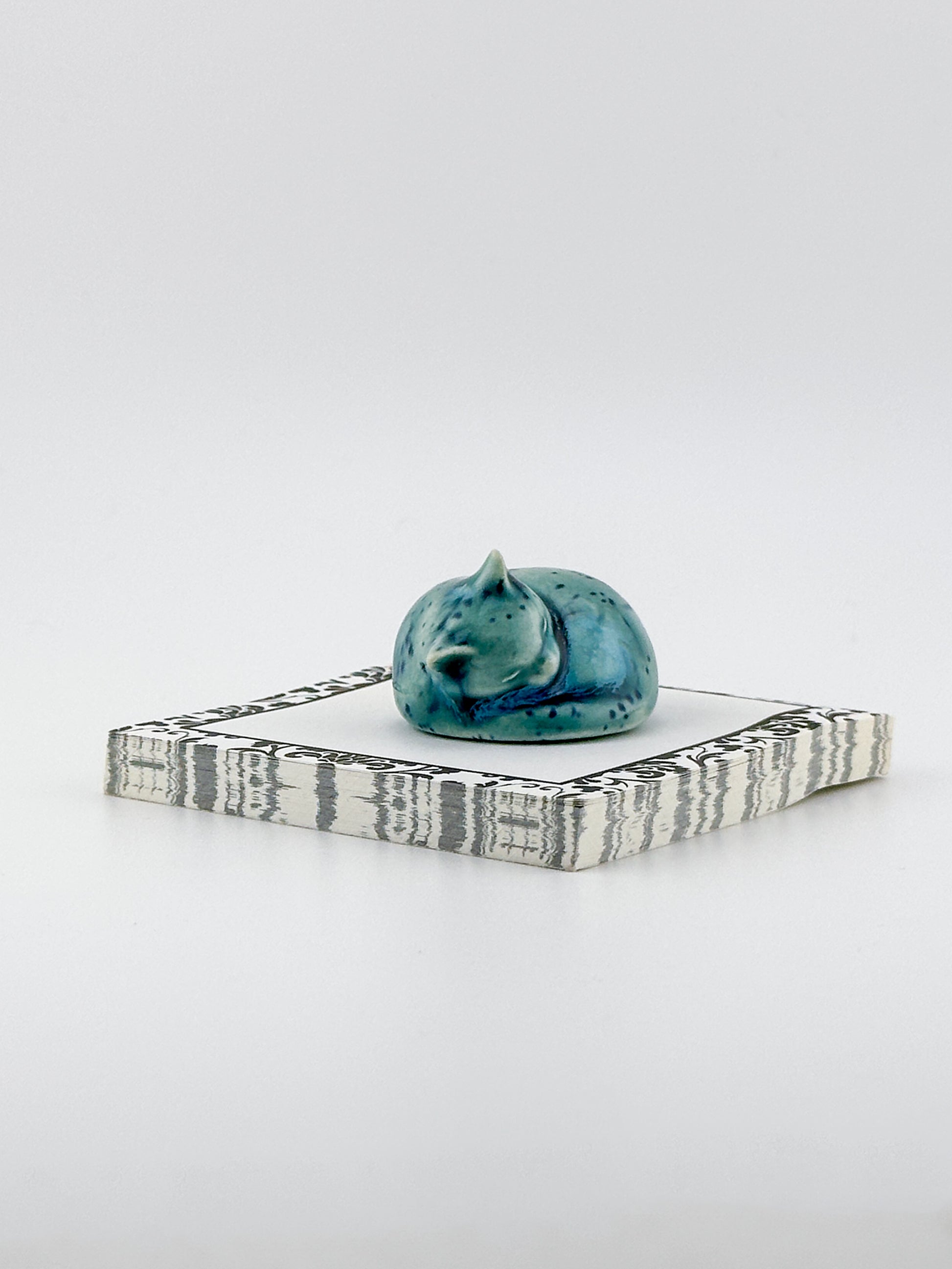 Add a touch of charm to your collection with this petite, handcrafted ceramic cat figurine. Measuring approximately 1.5 inches long and just over 1 inch tall, this adorable feline is curled up in a relaxed pose, exuding peaceful energy and calm.