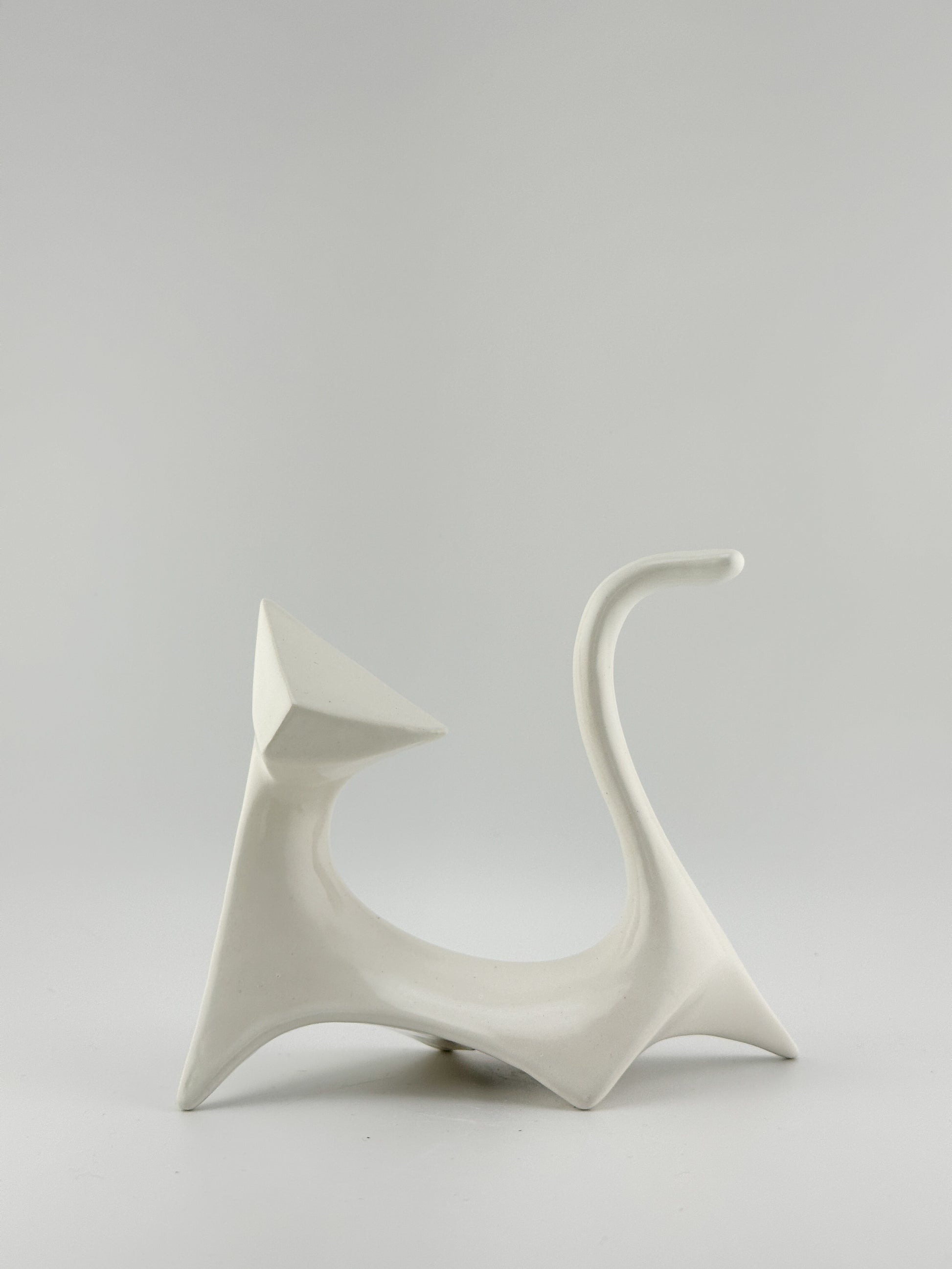This striking modern ceramic cat is a revival of a 1960s original, crafted using molds passed down from my grandmother. After decades of wear, the molds had begun to deteriorate, but I painstakingly restored and recreated them to preserve this iconic design. For nearly 20 years, I’ve been making and refining these sleek cats, ensuring each one captures the bold curves and playful elegance of the original mid-century form.