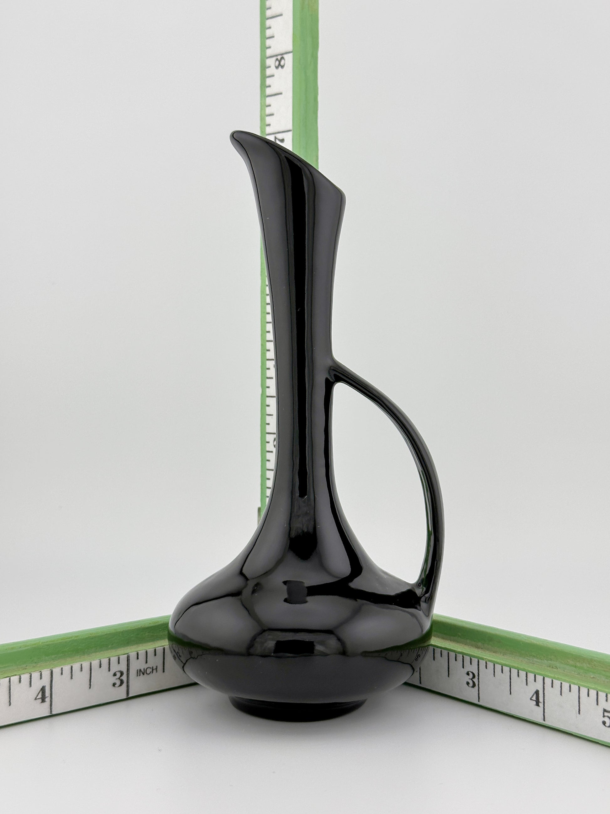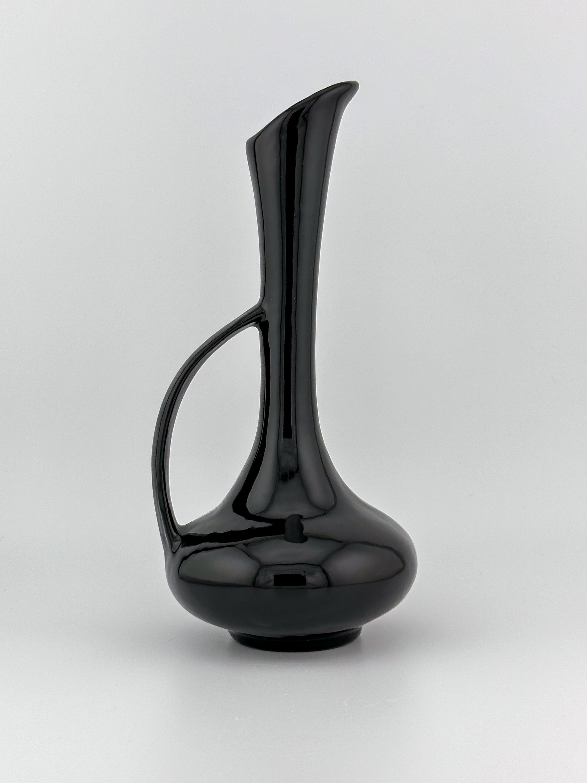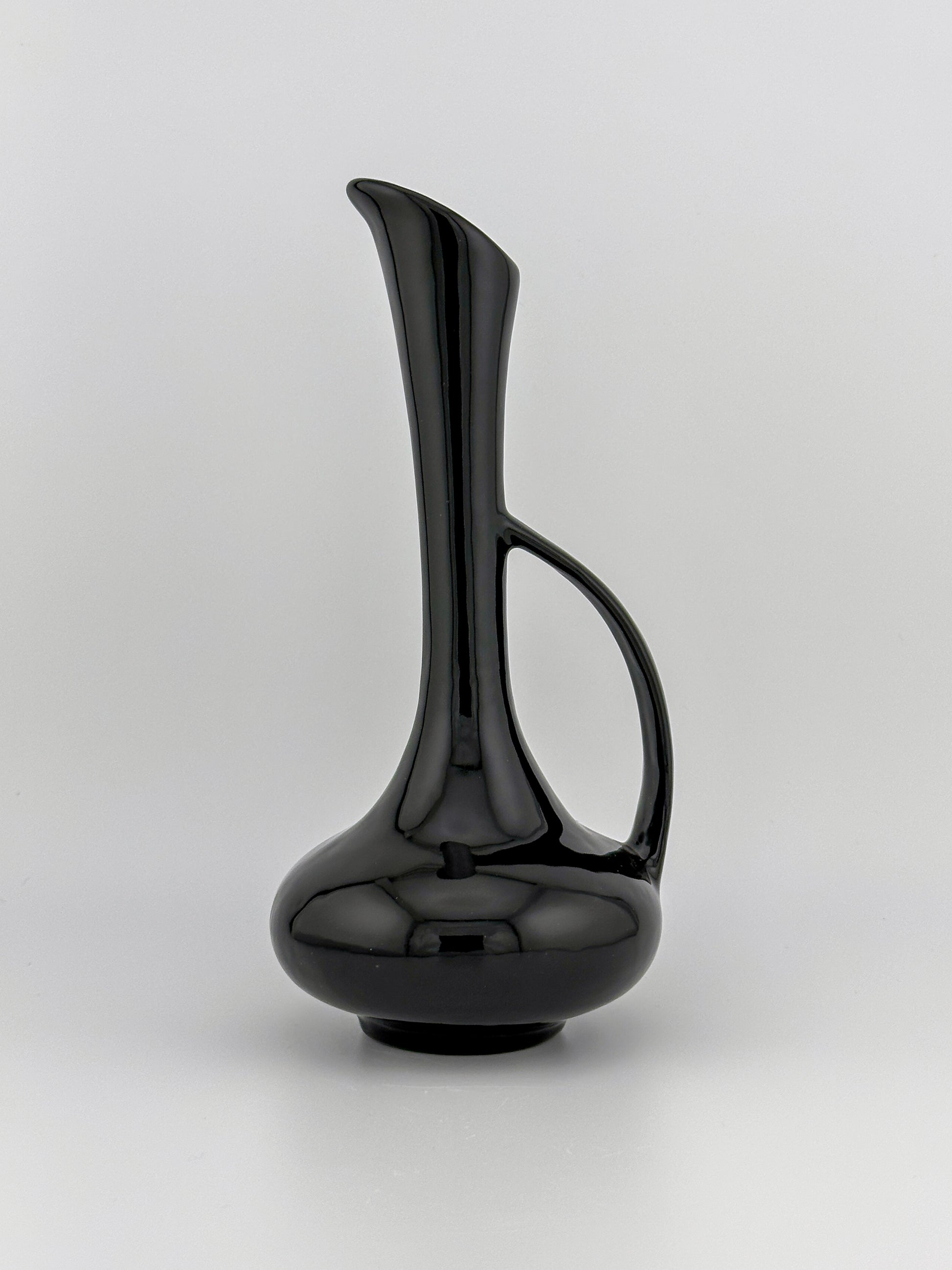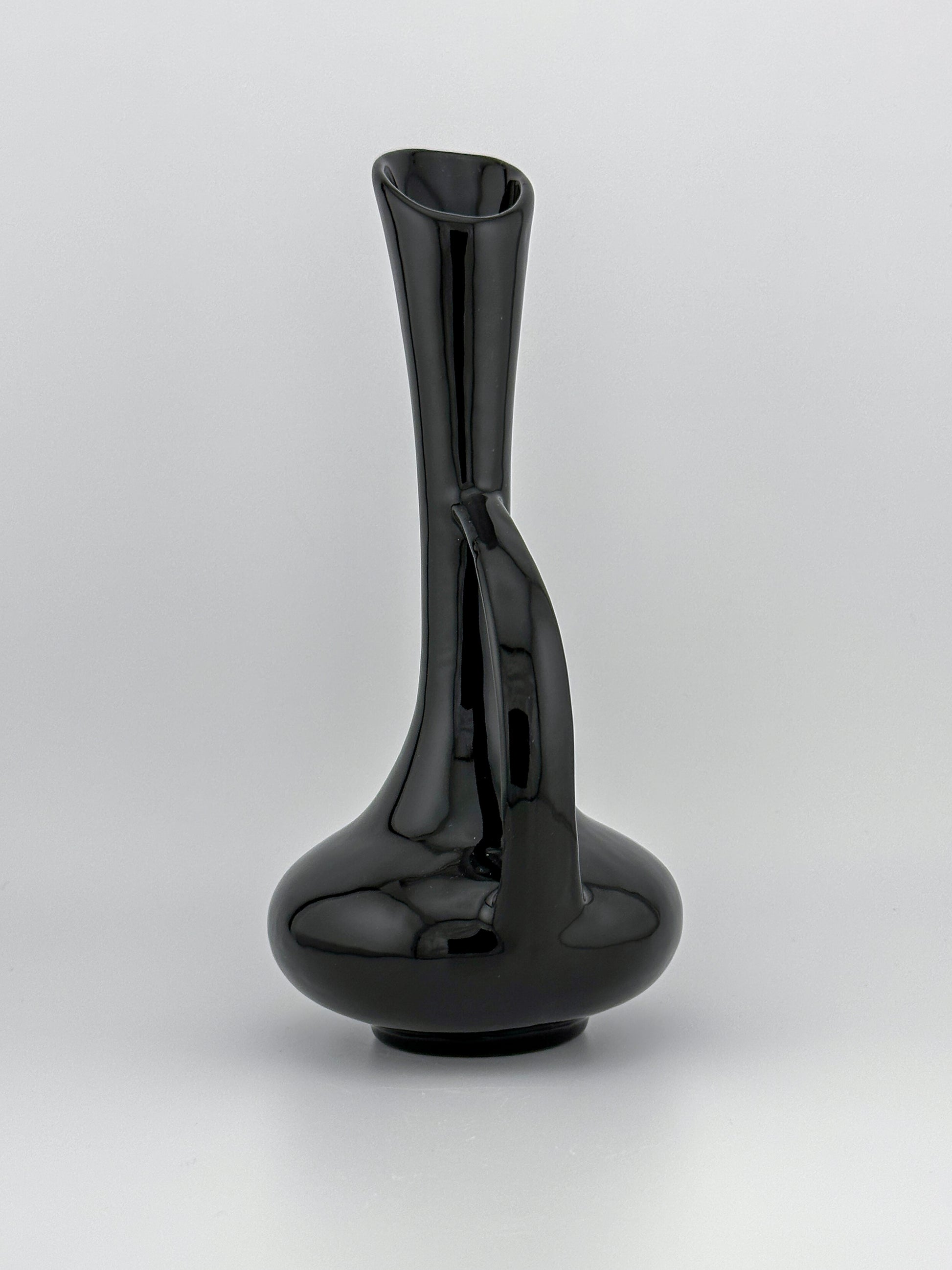 This elegant ceramic vase is crafted in a low-fire technique, showcasing a glossy black glaze with subtle variations in tone. Its distinctive form features a bulbous base that gracefully transitions into a slender, elongated neck, flaring slightly at the rim. The delicately curved handle seamlessly connects the body and neck, adding both visual interest and functionality. The vase’s smooth surface and gentle sheen highlight the fluidity of its design, reminiscent of mid-century modern aesthetics. A timeless decorative piece, it embodies both artistic craftsmanship and functional beauty, perfect for display or as a vessel for dried floral arrangements.