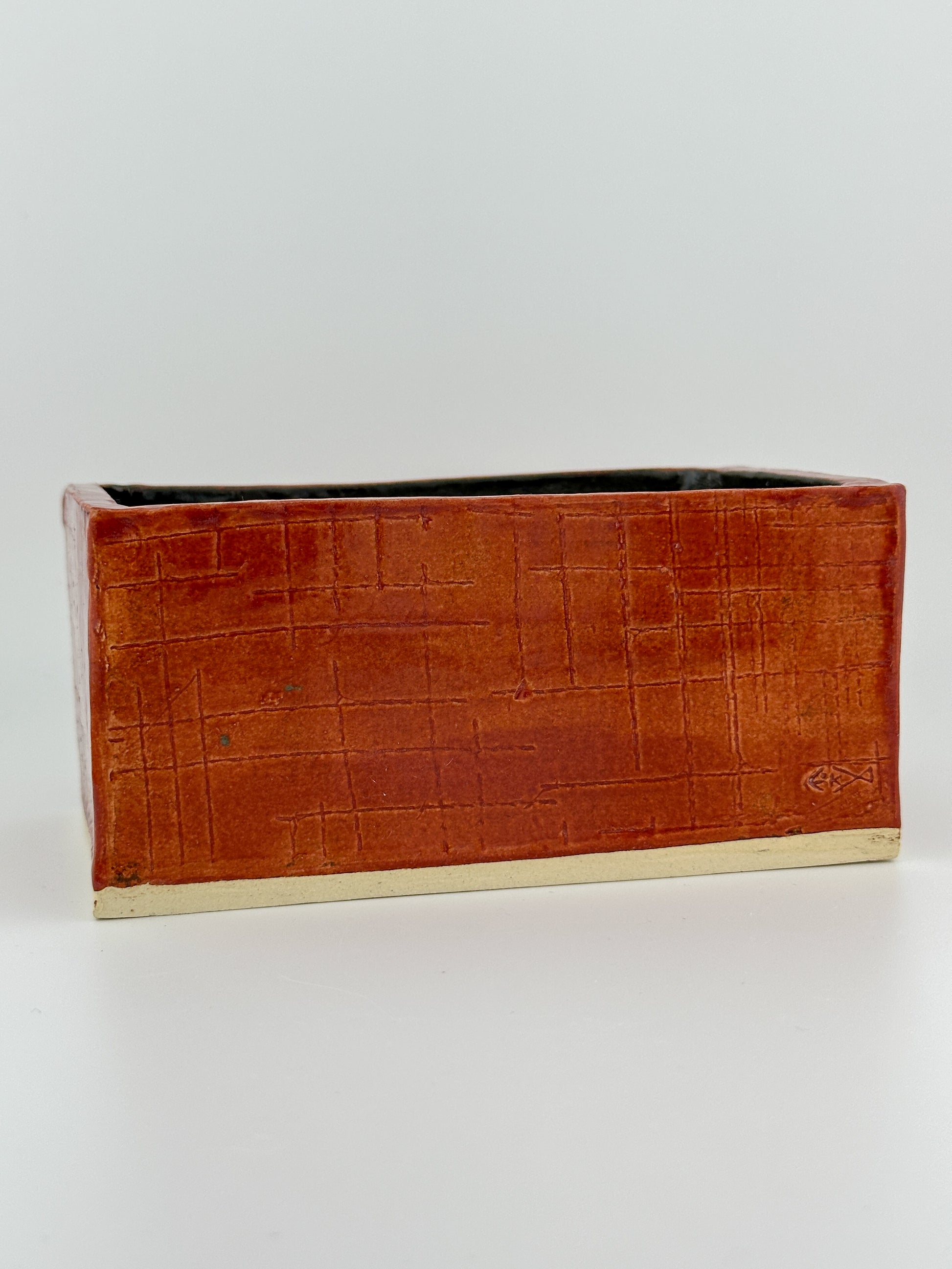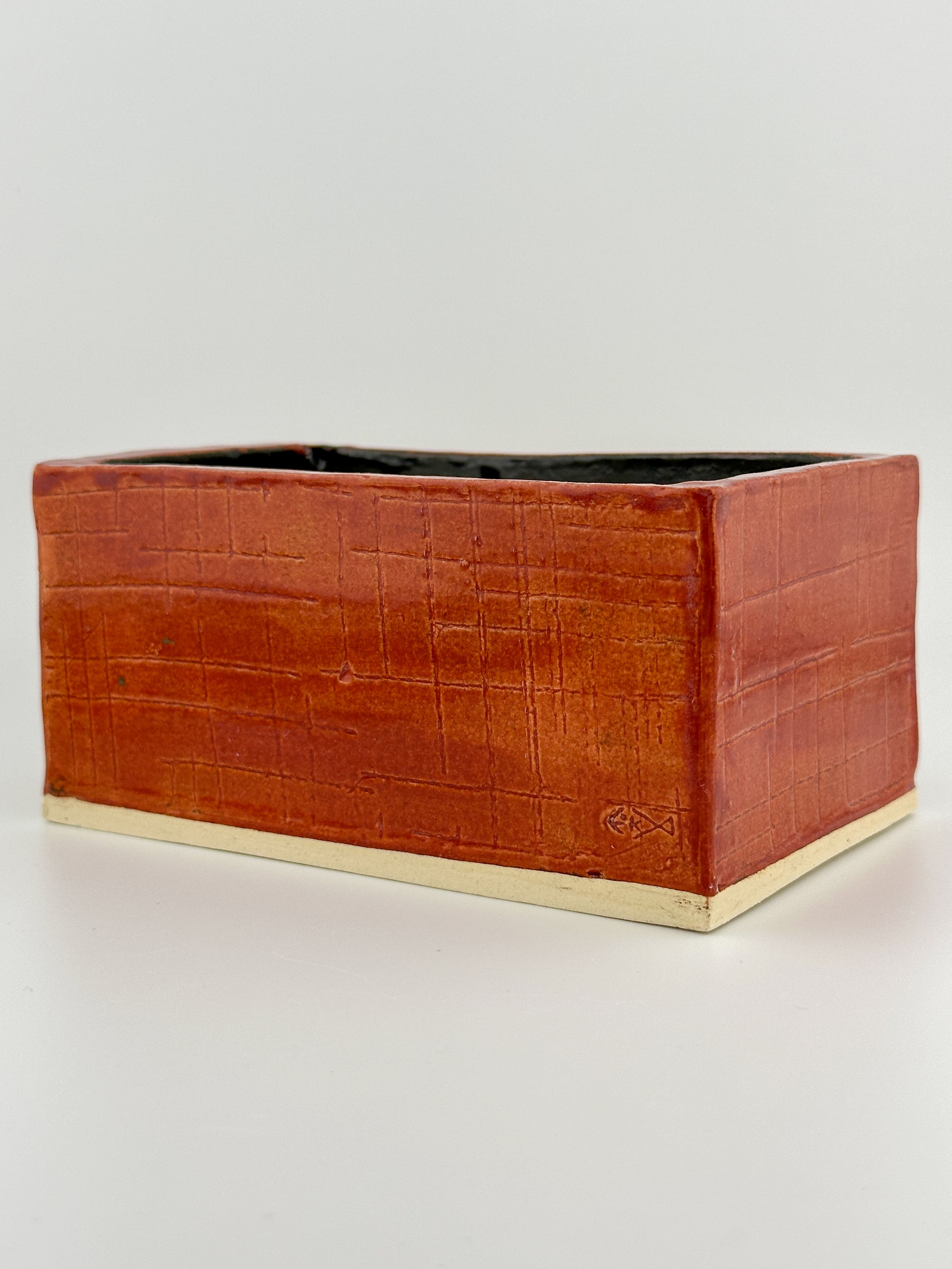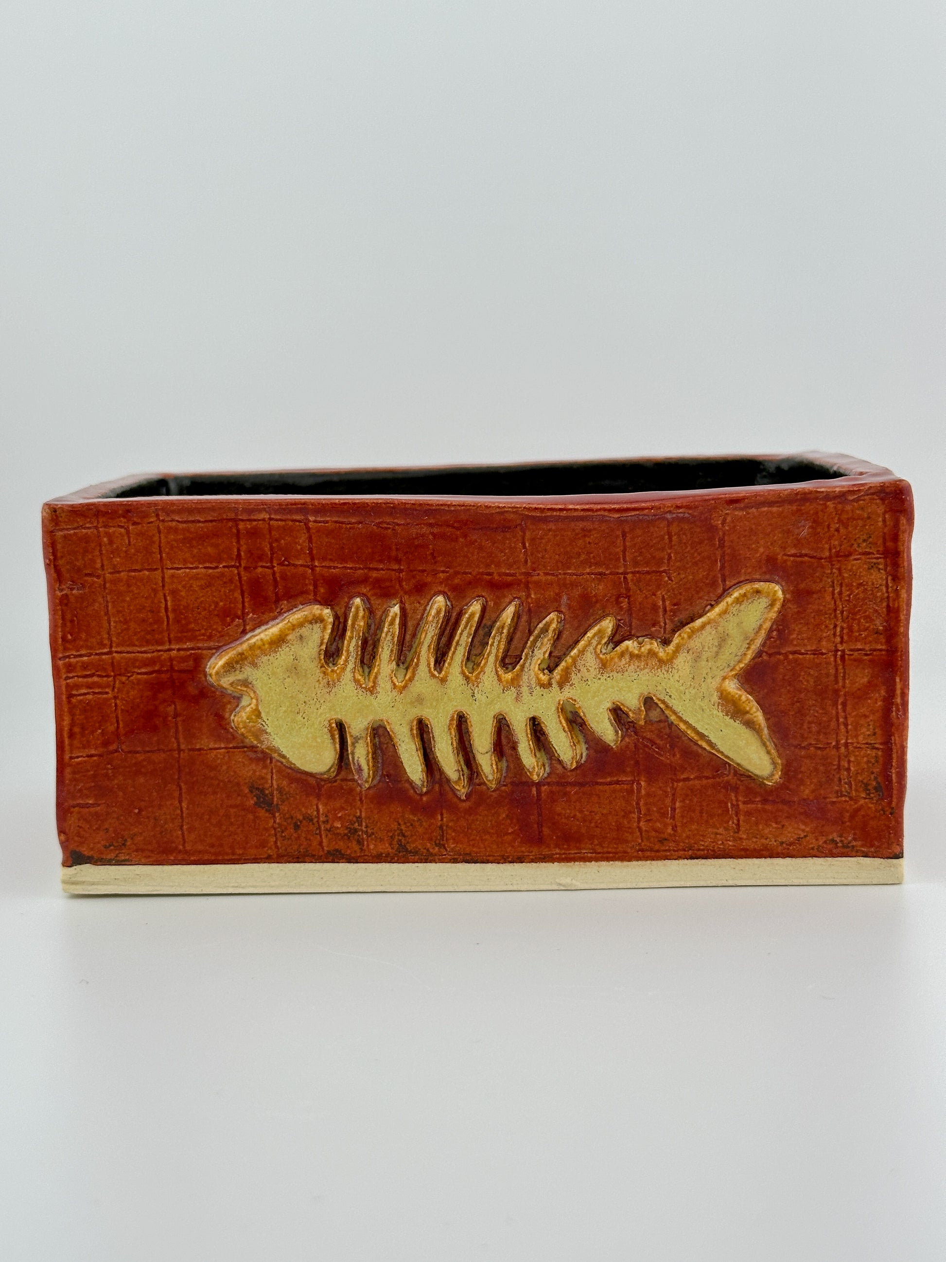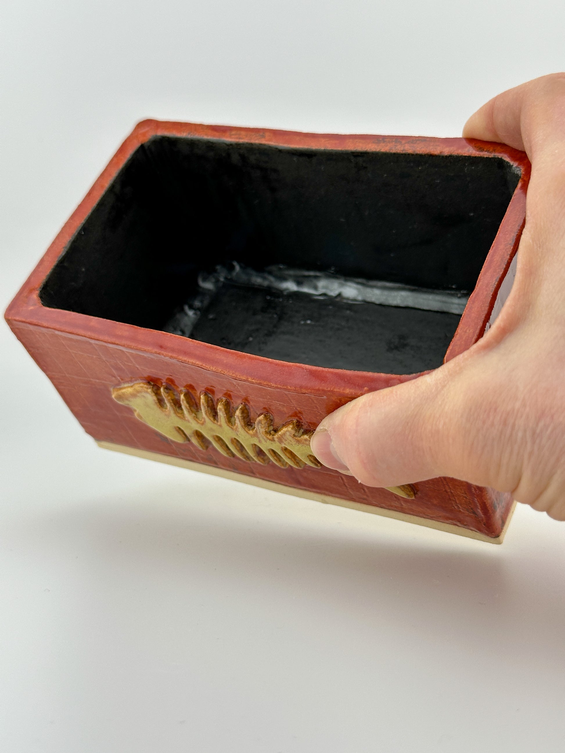 This handcrafted red ceramic box features a detailed, raised fish bones accent to the front. Each piece is individually made, with carved textures and layered red tones giving the box a rustic feel.