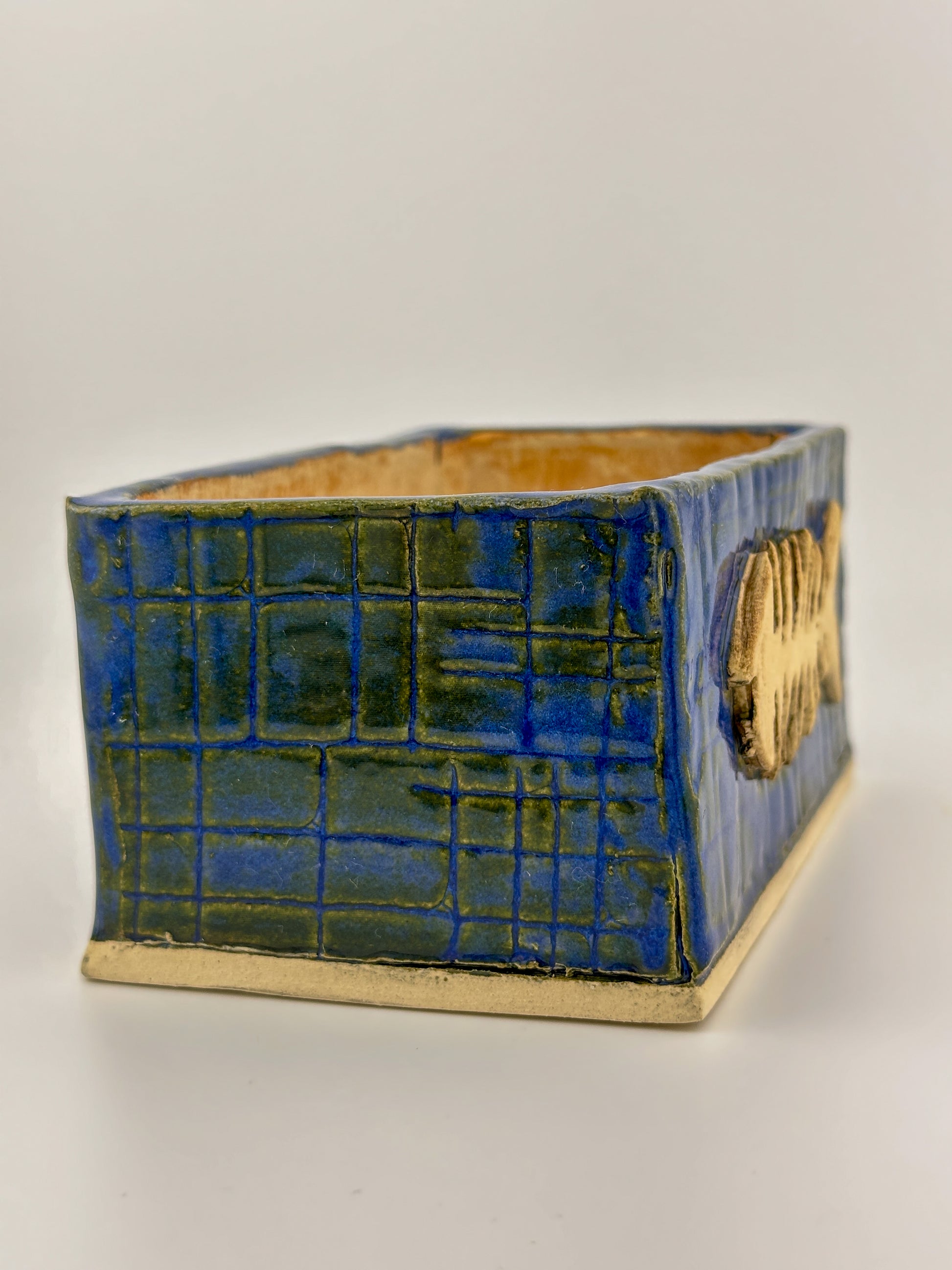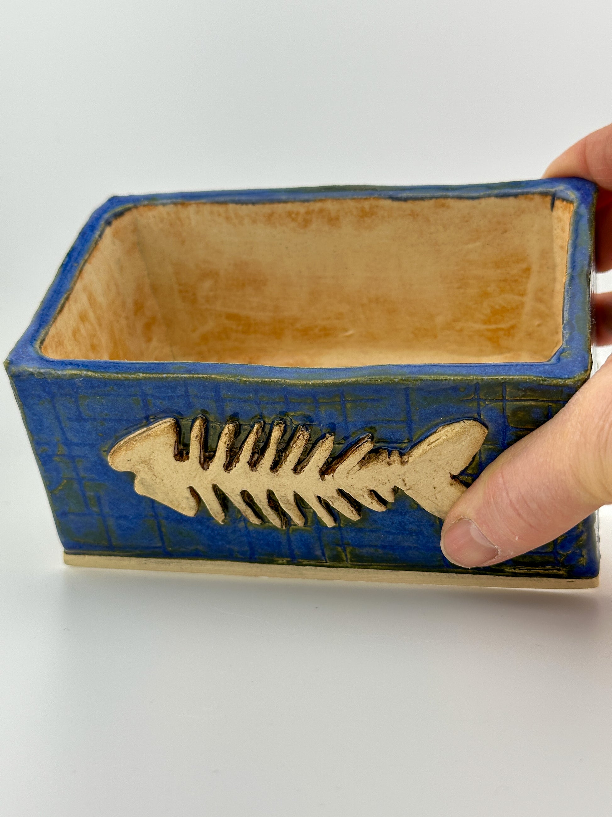 This handcrafted ceramic box features a detailed, raised fish bones on a richly glazed surface that evokes flowing water. Each piece is individually made, with carved textures and layered blue-brown tones giving the box a rustic, aquatic feel.